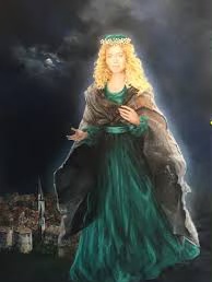 Une belle pèlerine est là sur le seuil ; son vêtement vétuste recouvre une robe de velours vert ; Elle est coiffée d’une couronne d’or agrémentée de pierres précieuses et de perles.